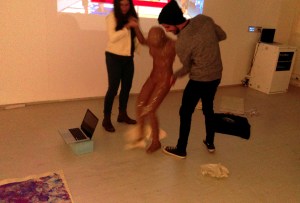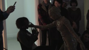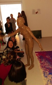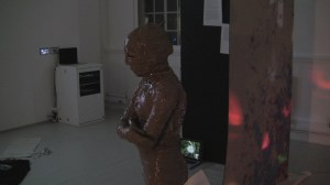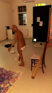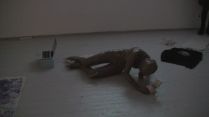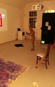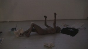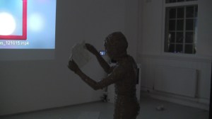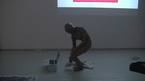 I appear in the space wrapped in brown packaging tape with its sticky side out and greet everybody present in the space with a hand shake and the words, ‘Nice to Meet You’. Spontaneously, I pick up the bits of paper from the floor and read them aloud, accidentally fall over because of the restricted moves and shout for help, followed by an act of recording the surroundings with the camera which was being used to record the performance itself and watching my own video on display before leaving the space.